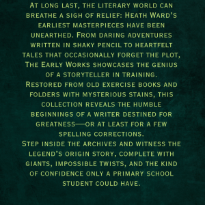 At long last, the literary world can breathe a sigh of relief: Heath Ward’s earliest masterpieces have been unearthed. From daring adventures written in shaky pencil to heartfelt tales that occasionally forget the plot, The Early Works showcases the genius of a storyteller in training. Restored from old exercise books and folders with mysterious stains, this collection reveals the humble…